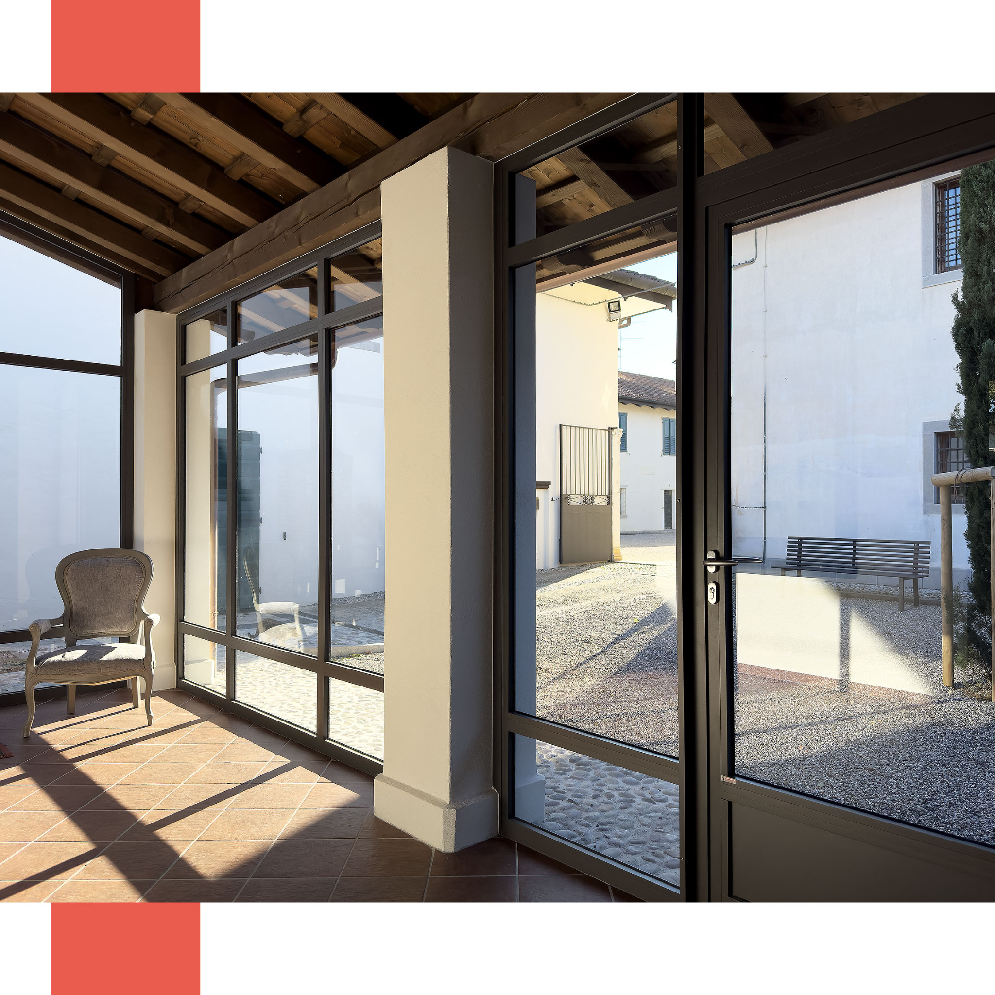 Per completare l’effetto stilistico, abbiamo inserito montanti e traversi intermedi che richiamano il fascino industriale d’epoca, integrandosi con eleganza nel contesto storico.